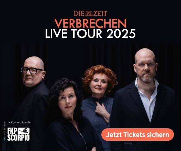 Im Herbst geht »ZEIT Verbrechen« auf große Arena Tour mit Live-Podcasts in Berlin, Düsseldorf, München und Hamburg. An jedem der vier Abende sprechen Anne Kunze, Daniel Müller, Sabine Rückert und Andreas Sentker über zwei spannende Kriminalfälle.