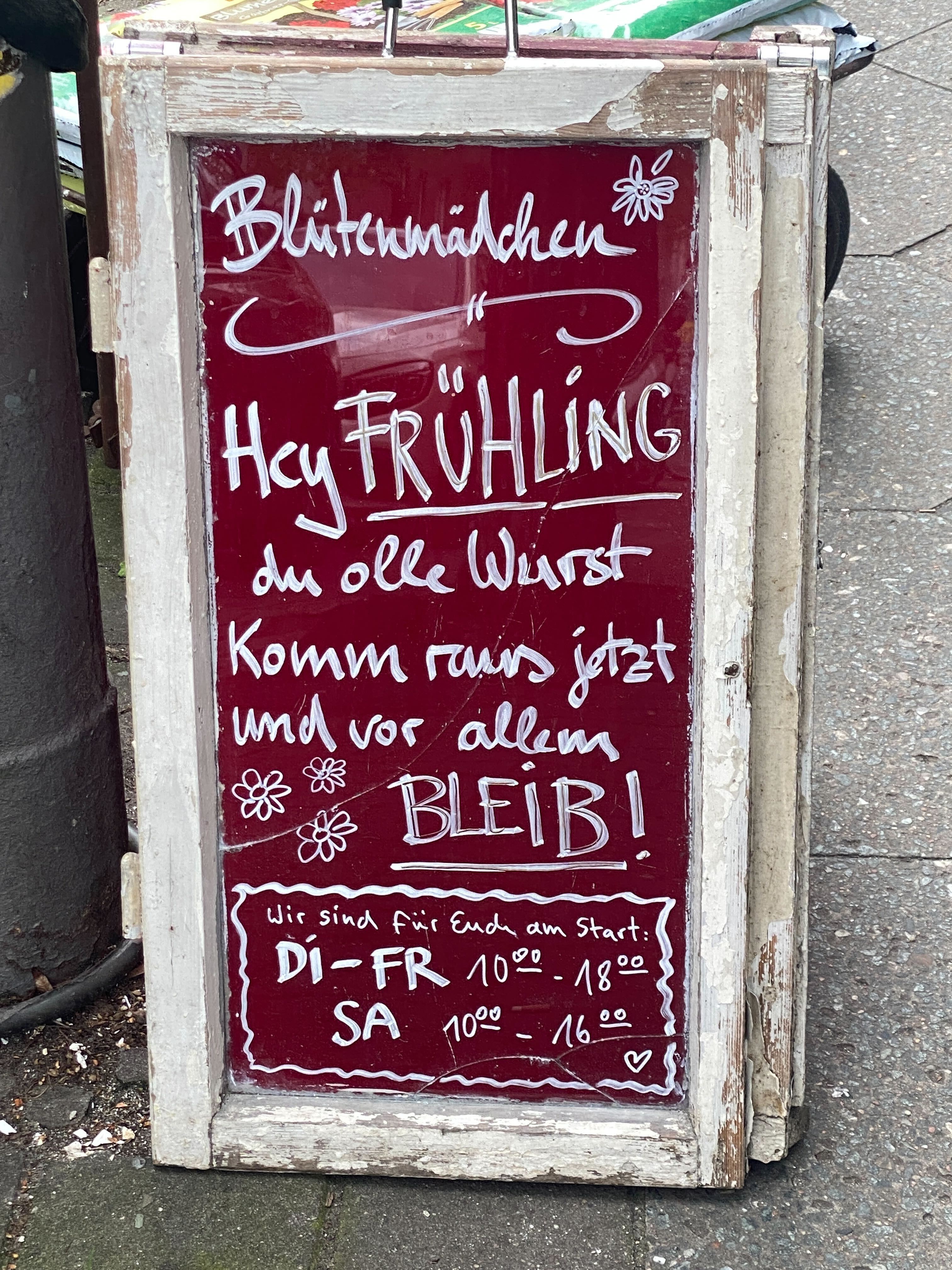 Appellativer Aufsteller in Richtung Wettergott. Der Blumenladen in der Weserstraße in Neukölln spricht uns doch gerade allen aus dem niedrigtemperaturgebeutelten Herzen, oder? (Foto: Thomas Lippold). Per checkpoint@tagesspiegel.de erreichen uns auch Ihre Berlin-Hingucker zu jeder Jahres- und Tageszeit.