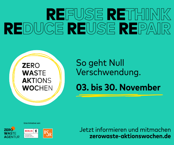 Vom 03. bis 30. November dreht sich in Berlin alles um Null Verschwendung. Entdecke Events rund um Kleidertausch, Reparieren, Lebensmittelrettung und vieles mehr. Auch für Fachpublikum gibt es Veranstaltungen z.B. zu Kreislaufwirtschaft. Schau ins Programm und melde Dich an: