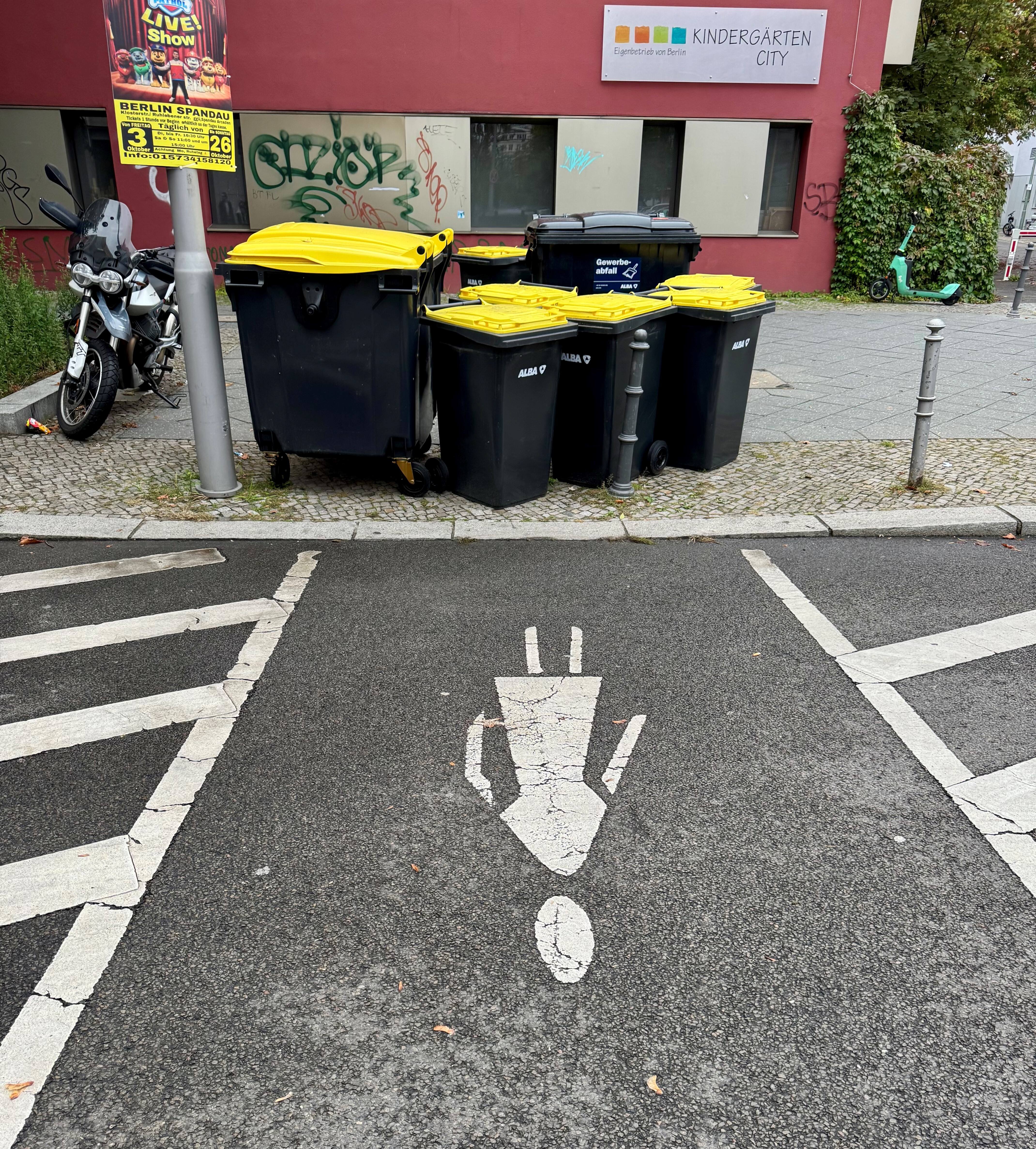 Ja und? Familie Mülleimer aus Mitte möchte hier eben die Straße queren! Dank an Leser Volker Schewitz. Weitere Scherzchen aus Berlin gern an checkpoint@tagesspiegel.de! Mit Ihrer Zusendung nehmen Sie aktuell an unserem Kiekste-Fotowettbewerb in Kooperation mit DASBILD.BERLIN teil.