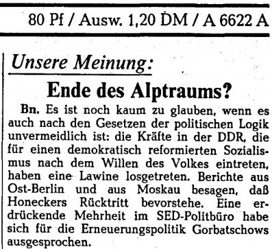 11.Oktober 1989, 29 Tage bis zum Mauerfall: Die Anzeichen für eine baldige Ablösung Erich Honeckers verdichten sich, offenbar steht der langjährige SED-Generalsekretär ohne Mehrheit da. Ist das das „Ende des Alptraums?“, fragt der Tagesspiegel in einem Kommentar. „Wenn es auch nach den Gesetzen der politischen Logik unvermeidlich ist: die Kräfte in der DDR, die für einen demokratisch reformierten Sozialismus nach dem Willen des Volkes eintreten, haben eine Lawine losgetreten.“