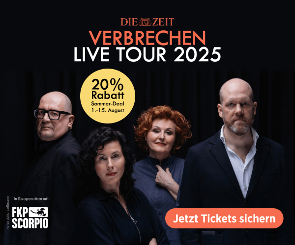 Im Herbst geht »ZEIT Verbrechen« auf große Arena Tour mit Live-Podcasts in Berlin, Düsseldorf, München und Hamburg. An jedem der vier Abende sprechen Anne Kunze, Daniel Müller, Sabine Rückert und Andreas Sentker über zwei spannende Kriminalfälle. Sichert euch jetzt 20% Rabatt auf alle Tickets beim exklusiven Sommer-Deal vom 1. bis zum 15. August!