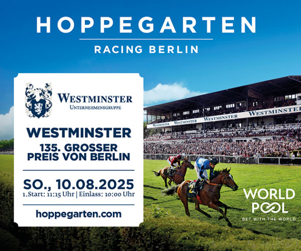 Am 10. August lädt Hoppegarten zum Westminster Großen Preis von Berlin – einem Höhepunkt des deutschen Galopprennsports. Genießen Sie Spitzensport im Grünen.