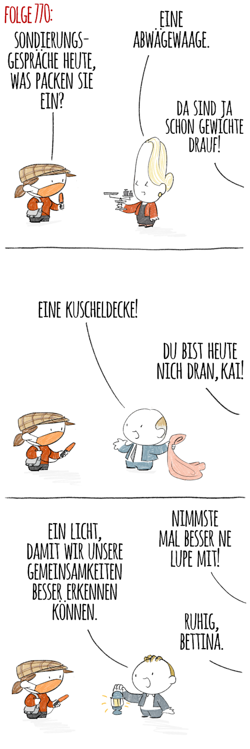 Also, heute ab 13 Uhr beginnt der erste Dreiergipfel: Die SPD empfängt Grüne und FDP im Kurt-Schumacher-Haus zur nächsten Sondierungsrunde. Die beiden Gäste haben hoffentlich Laufschuhe eingepackt. Die Wege, sie sind schließlich weit – und Blasen an den Füßen kann sich kurz vor dem Ziel keiner leisten. Am Dienstagmorgen um 10 Uhr kommen Linkspartei und Grüne in der SPD-Parteizentrale vorbei. Ab Ende der Woche sollen, so der Plan, Koalitionsverhandlungen aufgenommen werden. Die ersten Verhandler zweifeln aber schon, ob der Zeitplan zu halten ist. Ansonsten läuft alles, wie bisher, streng vertraulich – wer redet, ist raus. Diese Erfahrung musste zuletzt die CDU auf Bundesebene machen. Dort kennt man Jamaika jetzt nur noch als Urlaubsziel.