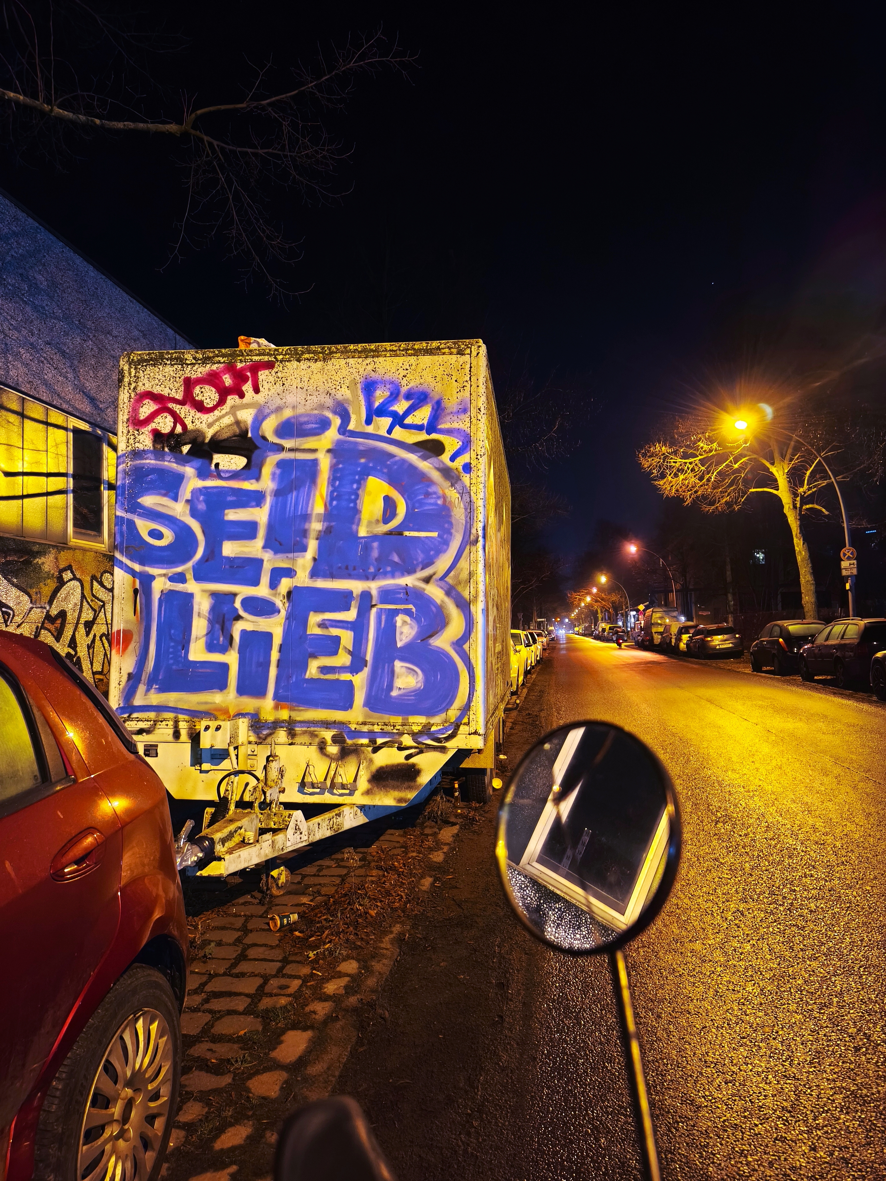Zwischen Neukölln und Treptow: Eine Botschaft, die wir uns alle mehr zu Herzen nehmen sollten. Gesehen von Checkpoint-Leserin Sabine Skott in der Treptower Straße. Vielen Dank! Schicken auch Sie uns Ihre Berlin-Momente an checkpoint@tagesspiegel.de und nehmen an unserem Kiekste-Fotowettbewerb in Kooperation mit DASBILD.BERLIN teil.