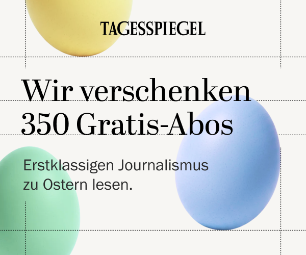 Unser Tipp: Sichern Sie sich eins der 350 Gratis-Abos, die wir zur Vorfreude auf Ostern verschenken. Lesen Sie den ungekürzten Checkpoint und den Tagesspiegel sechs Wochen lang kostenlos. Aber beeilen Sie sich – das gilt nur, solange der Vorrat reicht! Für Berlinkenner und alle, die es werden wollen. Dazu inspirierende Reportagen, exklusive Recherchen und fundierte Analysen aus Politik, Wirtschaft, Kultur und Sport. Im Newsletter, in der App und im E-Paper. Zur kostenlosen Bestellung geht’s hier unter diesem Link.
