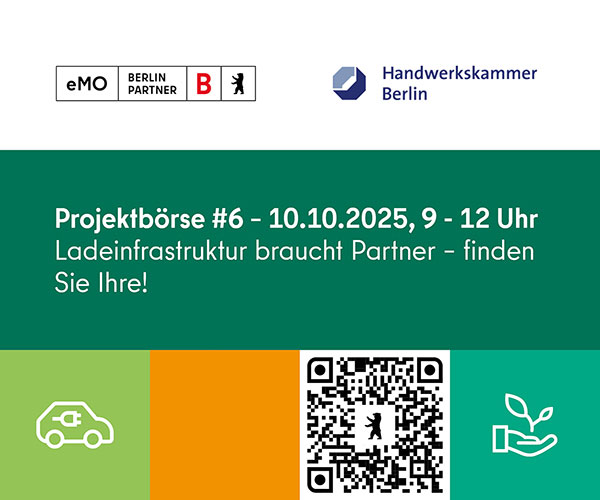 Sie wollen auf Elektromobilität umsteigen und suchen passgenaue Ladelösungen? Die Berliner Agentur für Elektromobilität eMO und die Handwerkskammer Berlin vernetzen Sie mit den richtigen Partnern – kostenlos und herstellerneutral. Am 10.10.2025 bei Berlin Partner im Ludwig-Erhard-Haus, jetzt anmelden!