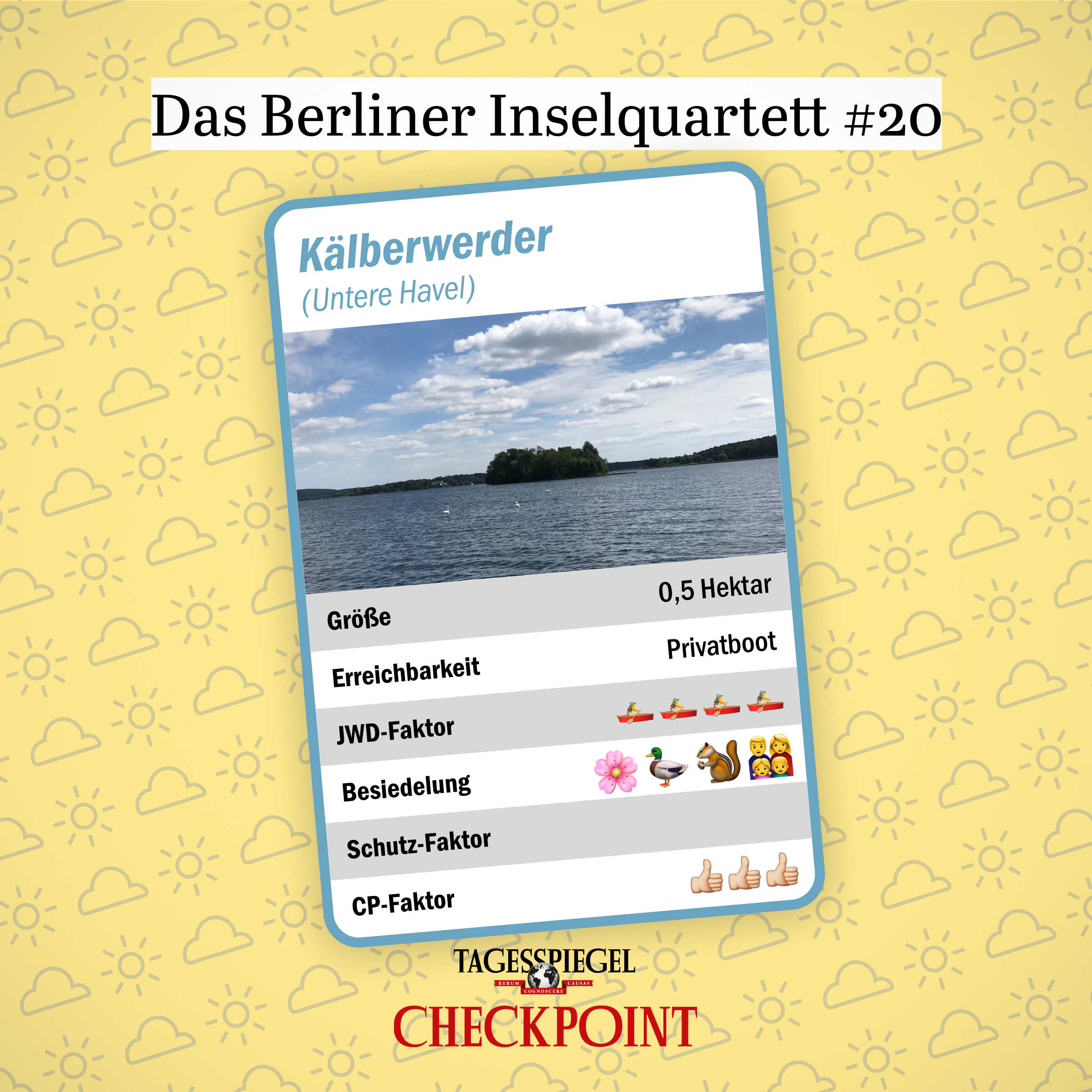 Team Checkpoint hat die Segel gehisst und alle Berliner Inseln besucht – es sind mehr als 50. An dieser Stelle und auf Instagram stellen wir Ihnen täglich eine davon vor. Und oben drauf gibt’s unser Inselquartett – zum Ausschneiden für lange Autofahrten in den Ferien und Sommer-Sehnsucht im Winter.