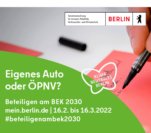 Brauchen wir mehr Ladesäulen oder besser Wasserstoff-Tankstellen? Wie kann komfortabler ÖPNV aussehen? Was muss sich beim Fuß- und Radverkehr ändern? Das Berliner Energie- und Klimaschutzkonzept 2030 formuliert 70 Maßnahmen für ein klimaneutrales Berlin im Jahr 2045. Jetzt beteiligen unter mein.berlin.de.
