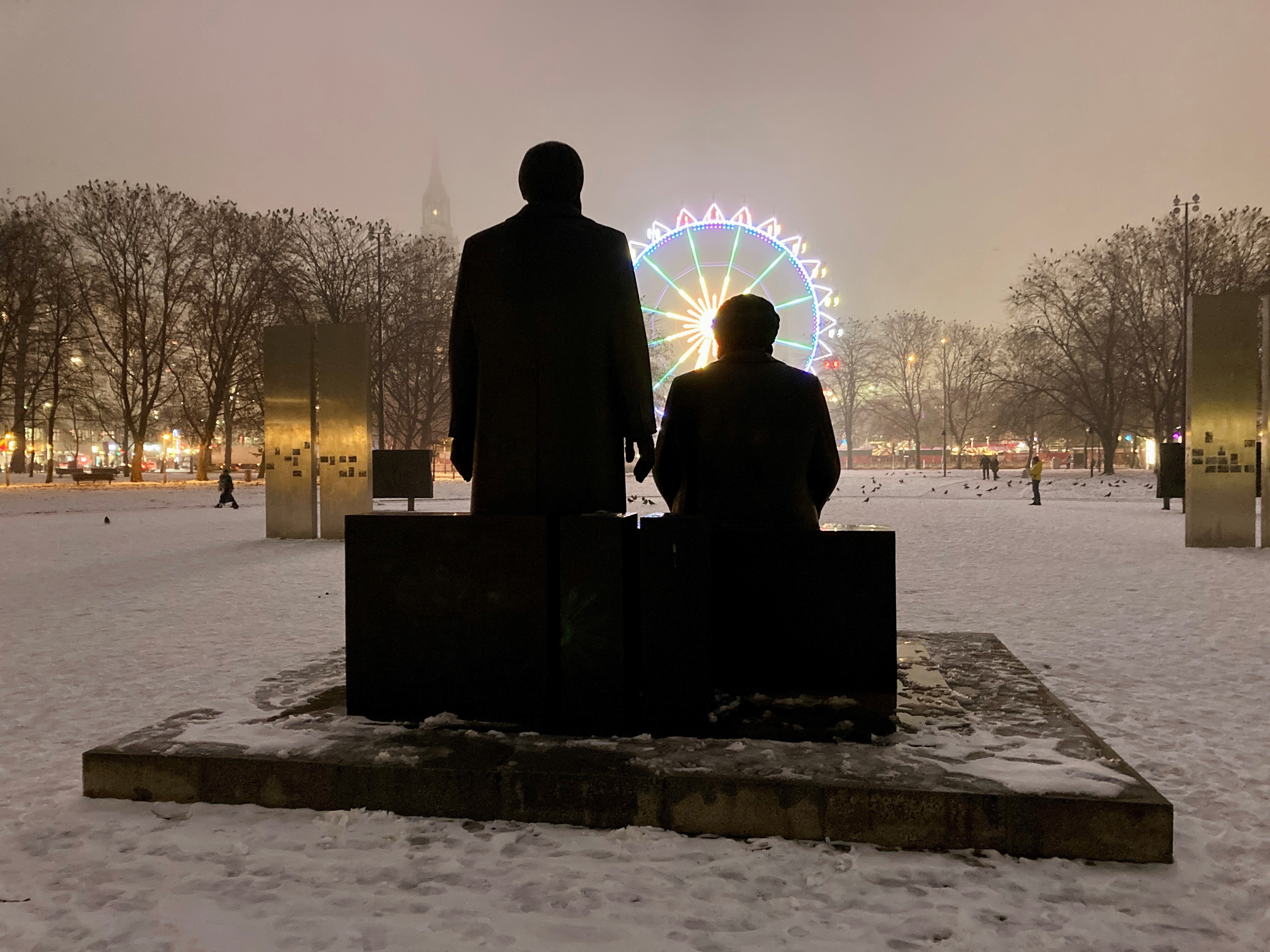 Scheinbar staunend betrachten Marx und Engels das Riesenrad am Alexanderplatz. Vielen Dank für dieses stimmungsvolle Foto an Tagesspiegel-Leser Sören Schrader! Ob besinnlich, erstaunlich oder einfach nur typisch Berlin, wir freuen uns auf Ihre Schnapsschüsse: checkpoint@tagesspiegel.de.