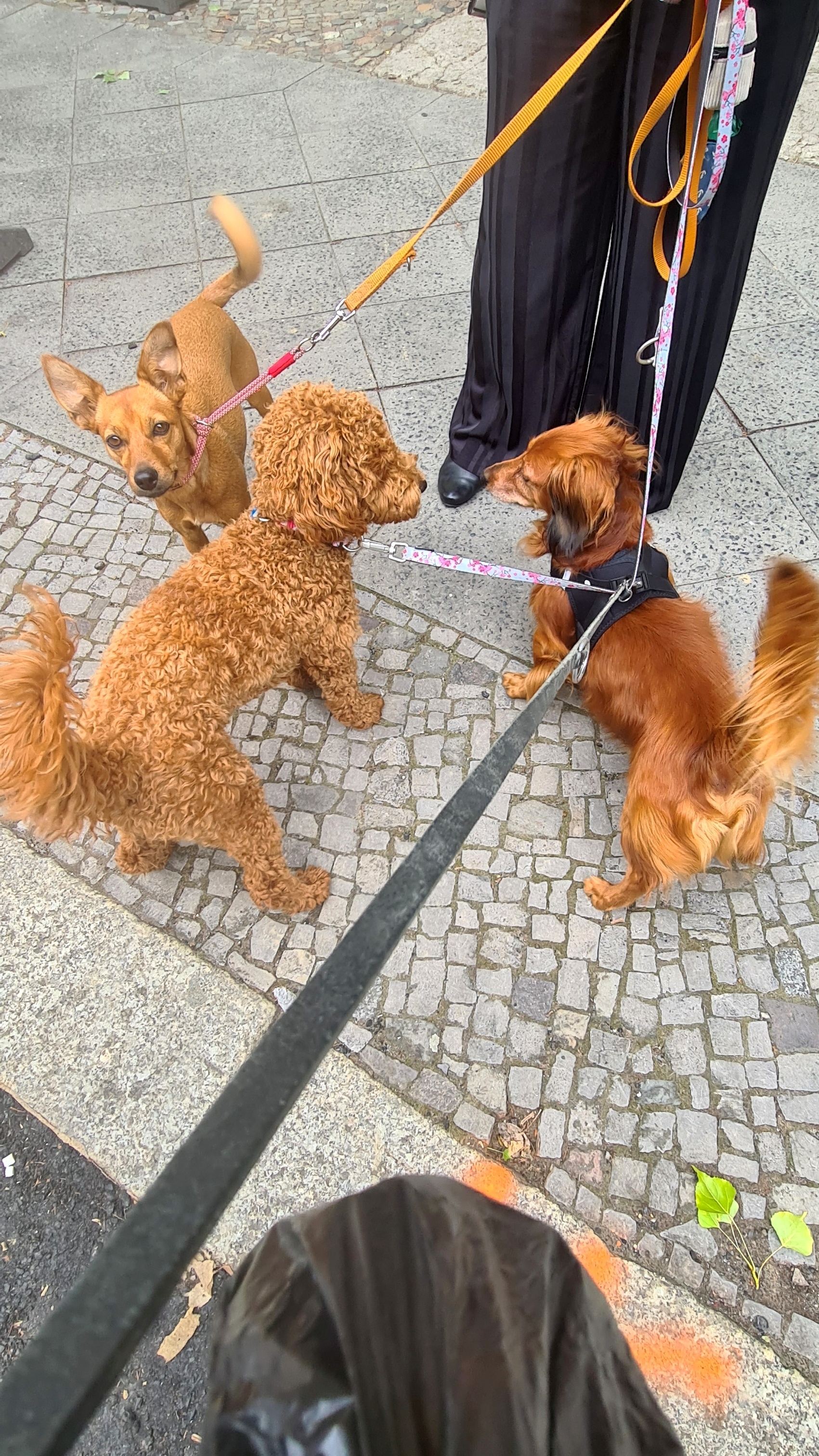 Treffen sich drei Cognac-Wuffis auf ein Tête-à-Tête. Renata Kaye war Zeugin in der Sredzkistraße. Weitere Bilder gern an checkpoint@tagesspiegel.de! Mit Ihrer Zusendung nehmen Sie aktuell an unserem Kiekste-Fotowettbewerb in Kooperation mit DASBILD.BERLIN teil.