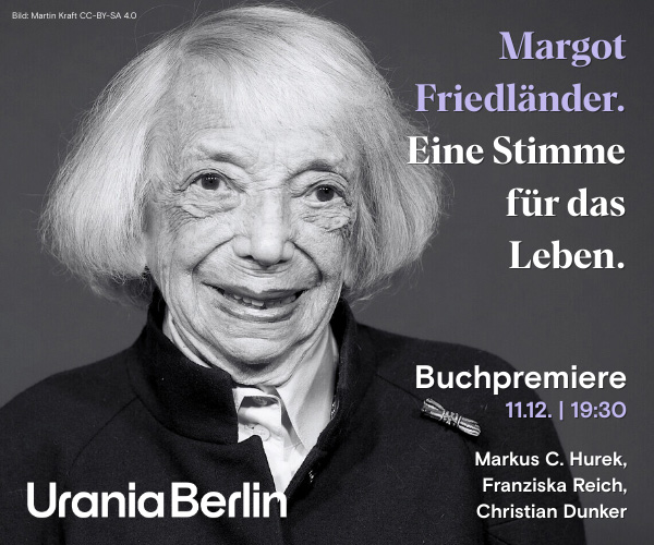 Es ist eine kraftvolle und berührende Hommage an eine der bedeutendsten Zeitzeuginnen der Shoah: ‚Margot Friedländer. Eine Stimme für das Leben.‘ (Suhrkamp) hat Premiere in der Urania Berlin. Christian Dunker (Geistesblüten) spricht mit Franziska Reich (FOCUS) und dem Fotografen und Herausgeber Markus C. Hurek.