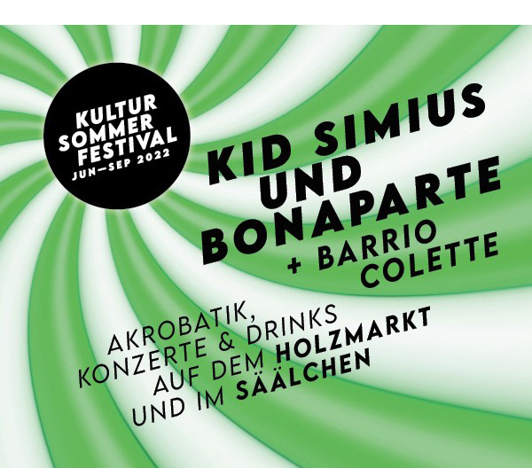 Kultursommerfestival meets Holzmarkt! Am 13. September spielen Bonaparte & Kid Simius ihr erstes gemeinsames Konzert in Berlin im Säälchen auf dem Holzmarkt. Als Special Guest kommt Barrio Colette. Auf dem Außengelände kann man auf bunte Zirkusartisten treffen und die ein oder andere akrobatische Darbietungen bestaunen. 17:30 – 22:30 Uhr.