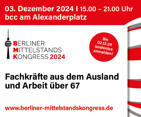 Die Rettung für den deutschen Mittelstand? Wer hilft bei der Suche nach Mitarbeitern und wie gelingt die Integration von Menschen aus anderen Kulturen im Unternehmen? Auf dem 10. Berliner Mittelstandskongress wollen wir Antworten liefern und Möglichkeiten aufzeigen. Und was sagt die Politik dazu? Anmeldung: www.berliner-mittelstandskongress.de