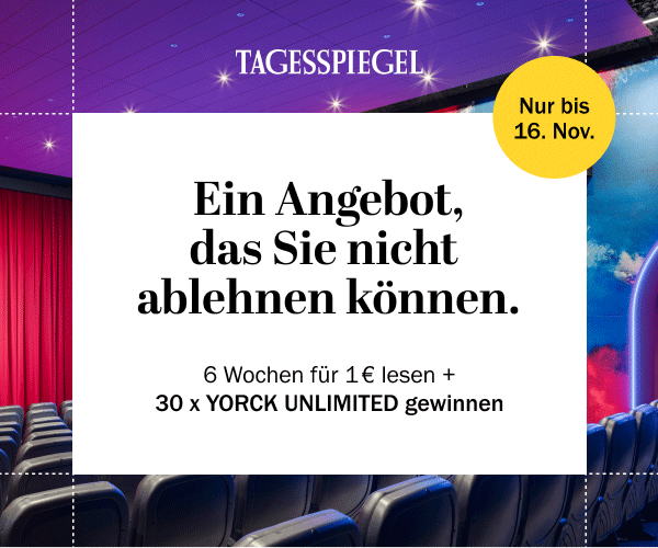 Probieren Sie es aus, es lohnt sich: Wenn Sie jetzt ein Abo abschließen, lesen Sie alle Bezahl-Angebote des Tagesspiegels sechs Wochen lang für nur 1 Euro. Und Sie haben die Chance auf eine von 30 YORCK-UNLIMITED-Tickets im Wert von jeweils 238,80 € und 50x2 Gutscheine für eine Vorstellung Ihrer Wahl in den Yorck Kinos. Jetzt hier bestellen.