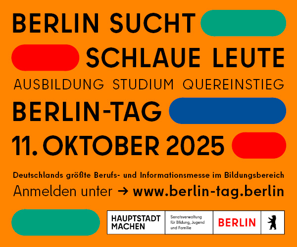 Berlin sucht die besten Fachkräfte (m/w/d) für Schulen, Kitas, Jugendämter, den Verwaltungsbereich und weitere Einrichtungen der Kinder- und Jugendhilfe. Erfahren Sie mehr bei Vorträgen, Beratungen und an den Ausstellerständen.