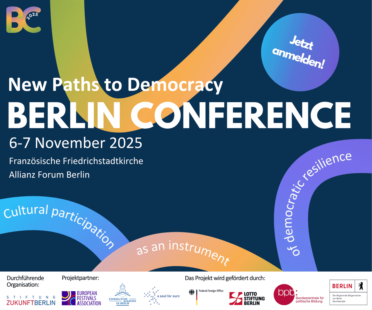 In Workshops und partizipativen Formaten wollen wir mit Ihnen die Ambivalenzen von Kultur und Demokratie diskutieren. Im Mittelpunkt steht die Frage, wie kulturelle Teilhabe zur demokratischen Resilienz beiträgt - in Europa und in Berlin.
