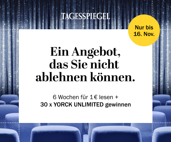 Ein Jahr lang kostenlos und unbegrenzt ins Kino! Lesen Sie dafür den Tagesspiegel 6 Wochen für 1 €. Unter allen Bestellern verlosen wir 30 YORCK UNLIMITED im Wert von jeweils 238,80 € und darüber hinaus 50x2 Gutscheine für eine Vorstellung Ihrer Wahl in den Yorck Kinos. Jetzt sichern. Das Angebot gilt nur bis 16.11.
