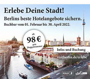 „Erlebe Deine Stadt!“ bietet allen Berliner*innen und Brandenburger*innen sowie deren Familien und Freunden einen Kurzurlaub in Berlin. Genießen Sie vom 01. Februar bis 30. April 2022 zwei Tage in den schönsten Luxus-, First-Class- und Comfort-Hotels Berlins im Doppel-, Einzel- oder Familienzimmer.