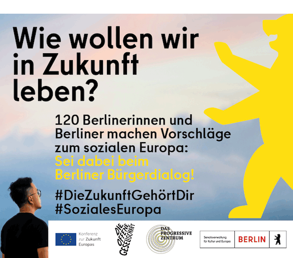 Berlin beteiligt sich an der europaweiten Debatte zur Zukunft Europas. Wir verschaffen den Berliner Ideen und Forderungen Gehör! Die Teilnahme ist ab 16 Jahren möglich. www.berlin.de/zukunftskonferenz