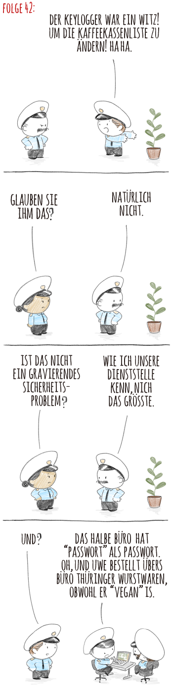 Ein Kaffeekassenguthaben von einer Millionen Euro wollte sich ein Polizeibeamter mit Hilfe eines Keyloggers heimlich im Computer seines Vorgesetzten gutschreiben. Behauptet jedenfalls IT-Staatssekretärin Sabine Smentek. Können Sie glauben (haha) oder auch nicht (ist ja vielleicht doch ein vertuschter Spionagefall…). In jedem Fall aber werden Sie jetzt viel Spaß haben mit der heutigen Folge unserer „Berliner Schnuppen“ von Naomi Fearn: