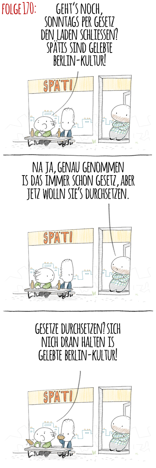 Frage: Was passiert eigentlich, wenn man einen Späti regelmäßig kontrolliert? Antwort: Nichts. Das Ordnungsamt Mitte hat beim Rosenback am Weinbergsweg (Ursprung des Dasselschen Ärgers) seit 2016 bereits 30 Verstöße registriert, manchmal wurden Bußgelder gezahlt, manchmal nicht. Fazit des Bezirksbürgermeisters: Reicht nicht, um den Laden dicht zu machen. Ob das jetzt beruhigend ist oder nicht, müssen Sie selbst entscheiden.