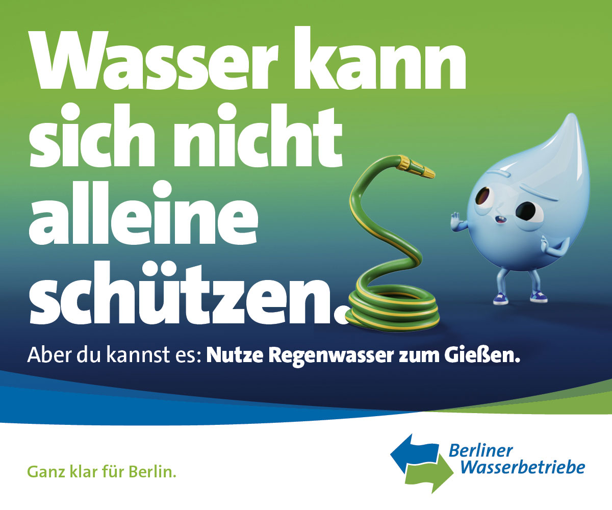 Damit uns in Berlin auch in Zukunft noch ausreichend Trinkwasser in bester Qualität zur Verfügung steht, müssen wir alle sorgsam damit umgehen. Zum Beispiel, indem wir im Garten Regenwasser nutzen. Damit helfen wir auch den Pflanzen, denn weiches Regenwasser tut ihnen gut. Ganz klar für Berlin. Mehr Tipps für den sorgsamen Umgang mit Wasser finden Sie auf: berlinerwasser.de