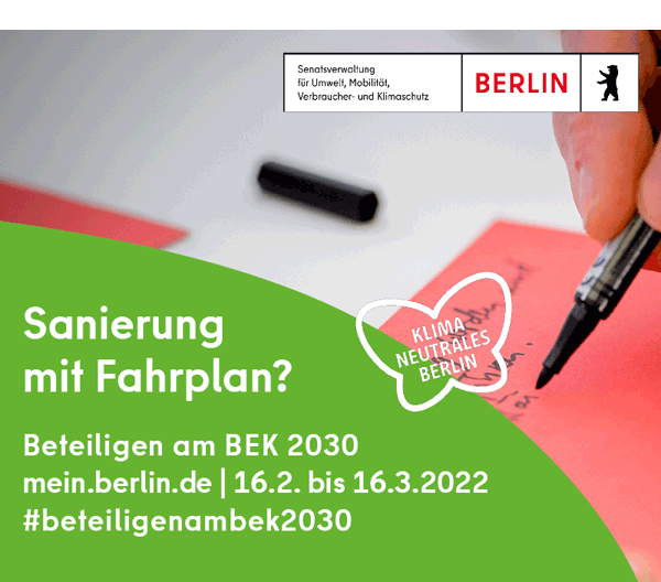 Das Bauinfozentrum erklärt künftig, wozu ein Sanierungsfahrplan gut ist und hilft weiter bei der energetischen Sanierung von Gebäuden. Das Berliner Energie- und Klimaschutzkonzept für den Umsetzungszeitraum 2022 bis 2026 hält über 70 Maßnahmen für ein klimaneutrales Berlin bereit. Jetzt noch beteiligen unter mein.berlin.de.