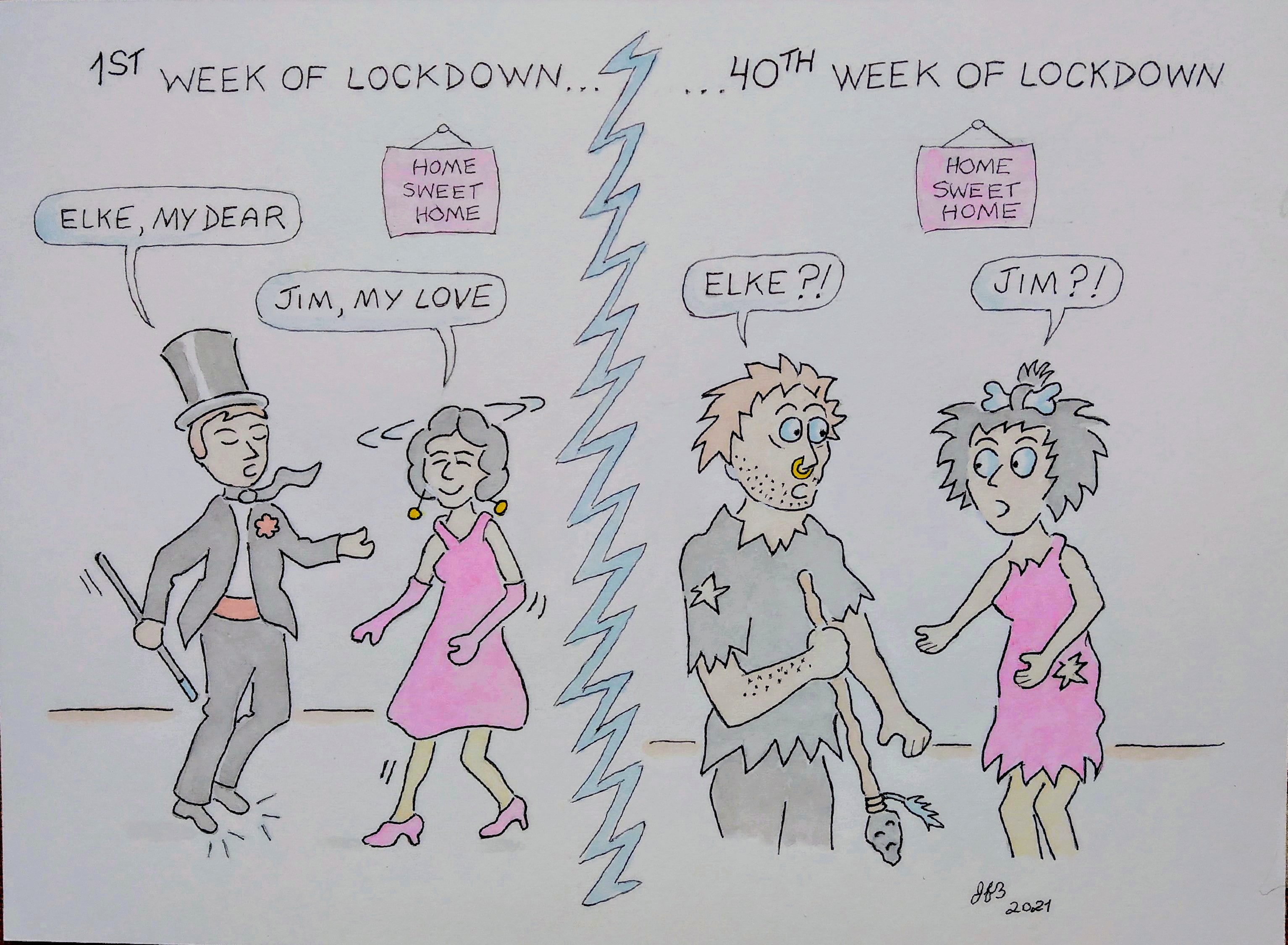 „Diesen Cartoon hat mein Mann für unseren Kalender gezeichnet. Ich hatte angemahnt, dass wir uns nicht so gehen lassen und uns auch für Zuhause ab und an ‚schick‘ machen“