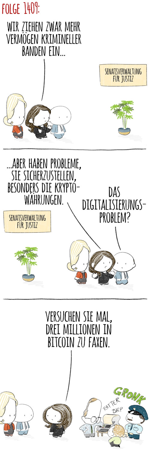 Und so gehen Sie vor: Sie reisen zum LKA nach Potsdam, ersteigern den Fallschirmkombianzug, nehmen ein Flugtaxi und springen über Lichtenberg ab, kapern den Apfelsinenwagen, halten kurz am Bundestag, um die Jacke abzuholen, fahren ein paar Meter weiter zum Hauptzollamt und laden zwei der Mülleimer ein, biegen auf die Potsdamer Straße ein und fahren immer geradeaus nach Süden, wo die Abou-Chaker-Gold-Awards auf Sie warten. Diese stecken Sie in die Mülleimer und fahren zurück zur Sonnenallee, wo Sie einen Kramladen aufmachen, den die ortsansässigen Clans zur Geldwäsche nutzen. Warten sie darauf, dass der Zoll das meiste beschlagnahmt und der Checkpoint die nächste Versteigerung annonciert. Dann stellen Sie den Rest auf die Straße, machen eine Meldung bei der Ordnungsamts-App – und schon sind Sie angesehener Marktteilnehmer der berühmten Berliner Kreislaufwirtschaft.