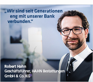 Robert Hahn, Geschäftsführer von HAHN Bestattungen, führt das Unternehmen bereits in sechster Generation. Es ist das älteste Berliner Bestattungsinstitut in Familienbesitz. Seit mehr als 70 Jahren ist die Berliner Volksbank vertrauensvoller und enger Partner des Familienunternehmens.