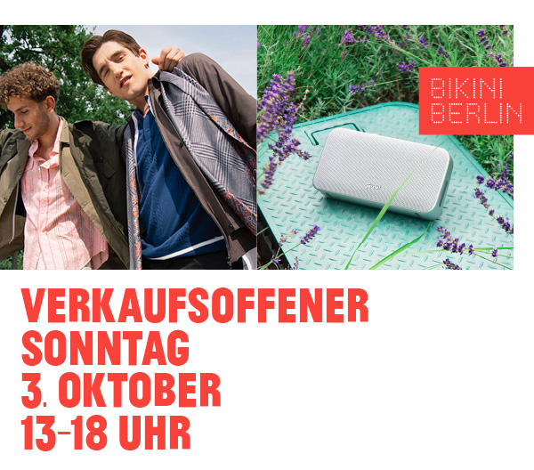 Am 03. Oktober ist Verkaufsoffener Sonntag! BIKINI BERIN lädt Besucher und Besucherinnen zum Flanieren und Schnabulieren in die grüne Oase Berlins ein. Die Concept Shopping Mall wartet mit attraktiven Angeboten von spannenden Pop-Up-Boxen und Mietern wie Mykita, Premiata, Teufel, Tebton oder Gant auf Ihren Besuch. Vorbeischauen lohnt sich!