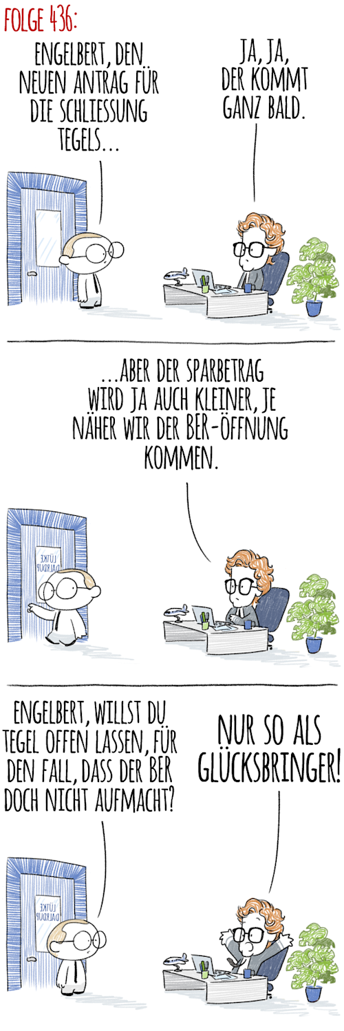 wir beginnen mit dem Trailer zur neuen Staffel von „Die wunderbare Welt des Engelbert“ – Titel: „Tegel-Aus verzögert sich“. Die Story: Eine Stadt versucht, einen Flughafen zu eröffnen und einen Flughafen zu schließen, doch seit Jahren will weder das eine, noch das andere gelingen. Was zuletzt geschah: Weil wegen einer Pandemie kaum noch jemand flog, wollte der Flughafenchef TXL früher schließen, obwohl BER noch nicht eröffnet ist. Jetzt stellt sich heraus: Weil plötzlich alle wieder fliegen wollen, ist SXF allein mit Abstand zu klein. Die Rettung: Weil der Schließungs-Antrag zum 15. Juni für TXL sowieso zu spät… aber wir wollen hier nicht zu viel verraten – fest steht jedenfalls: Die Geschichte wird noch einige Loopings nehmen (mehr zu Tegel weiter unten in der Rubrik „Tschüssikowski“).