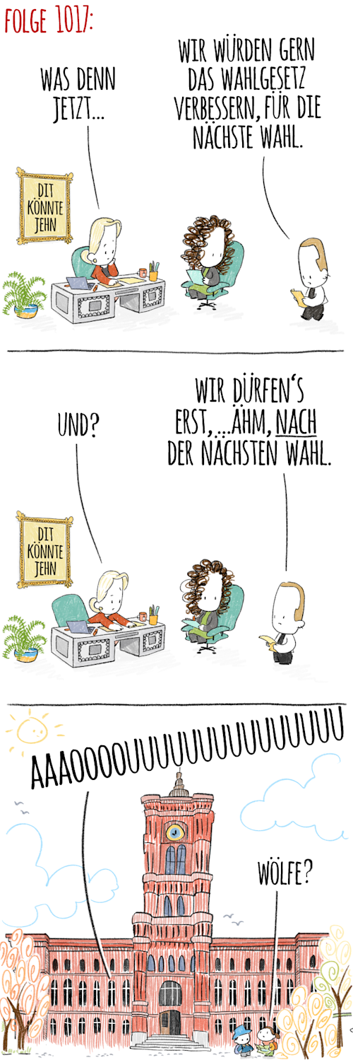 Noch einmal 43 Tage später wird in Berlin wohl gewählt. Die vergangene Wahl, heißt es immer, wird dann wiederholt. Faktisch stimmt das nur halb: Die Kandidaten bleiben zwar die gleichen, aber die Wählerverzeichnisse sind neu. Die politische Großwetterlage hat sich ohnehin geändert. Alles anders also? Nein! Zwölf von unbeugsamen Politikern regierte Bezirke leisten Widerstand. Bezirksbürgermeister und Stadträte können nämlich nur mit einer Zwei-Drittel-Mehrheit der Bezirksverordnetenversammlungen (BVV) abgewählt werden. Sie erhielten in diesem unwahrscheinlichen Fall übrigens auch weiter Geld. Berlin könnte dutzende Stephan von Dassels bekommen, wie Kollege Daniel Böldt recherchiert hat. Die Wahlwiederholung in den Bezirken könnte also kaum Einfluss auf die Bezirksregierungen haben. Es stellt sich die Frage: Wer geht zur Wahl, wenn sich die einzig bekannten Gesichter im Bezirk damit nicht austauschen lassen? Was unterscheidet die Wahl dann noch vom Wahlzirkus?