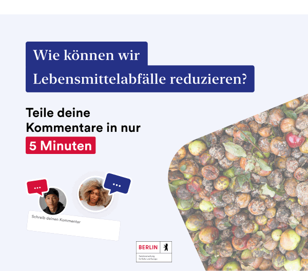 Das Thema Lebensmittelverschwendung liegt dir am Herzen? Die Berlinerinnen und Berliner haben viele Ideen, um die Menge des Lebensmittelabfalls bis 2030 um 50 % zu reduzieren. Entdecke ihre Vorschläge, teile deine eigenen und initiiert gemeinsam konkrete Projekte auf berlin-europa.de