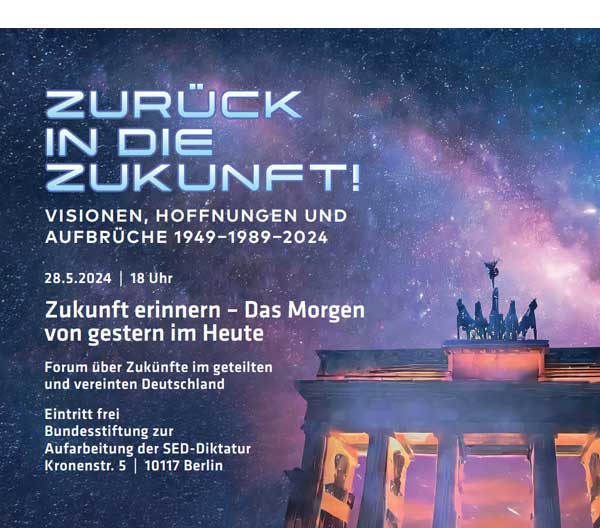 Zukunft ist Gegenwart, Zukunft hat Geschichte: Am 28. Mai startet die neue Veranstaltungsreihe „Zurück in die Zukunft! Visionen, Hoffnungen und Aufbrüche 1949-1989-2024“ der Deutschen Gesellschaft und der Bundesstiftung Aufarbeitung. Erkunden Sie Aufbruchsmomente und Zukünfte in der deutschen Zeitgeschichte.